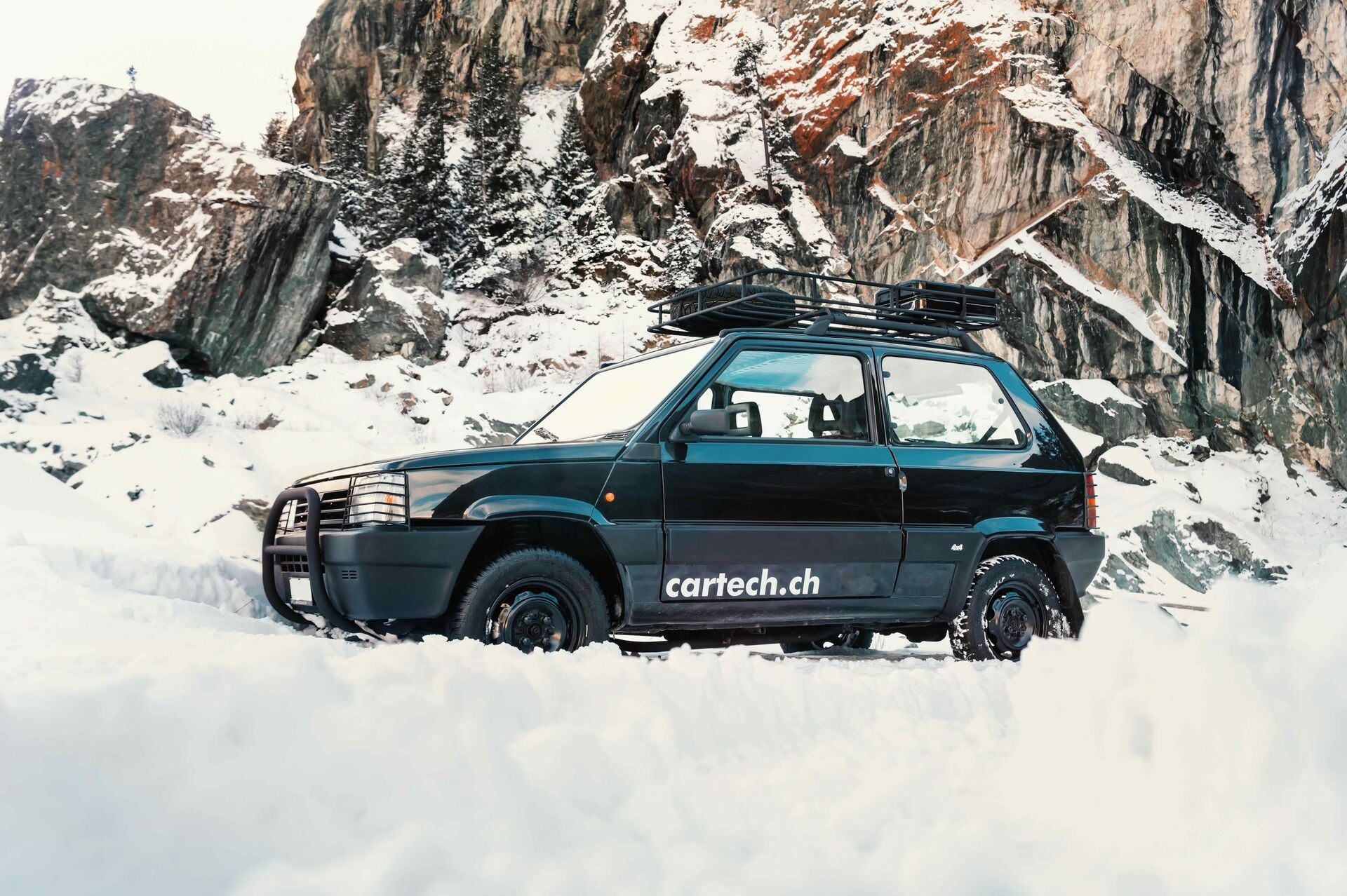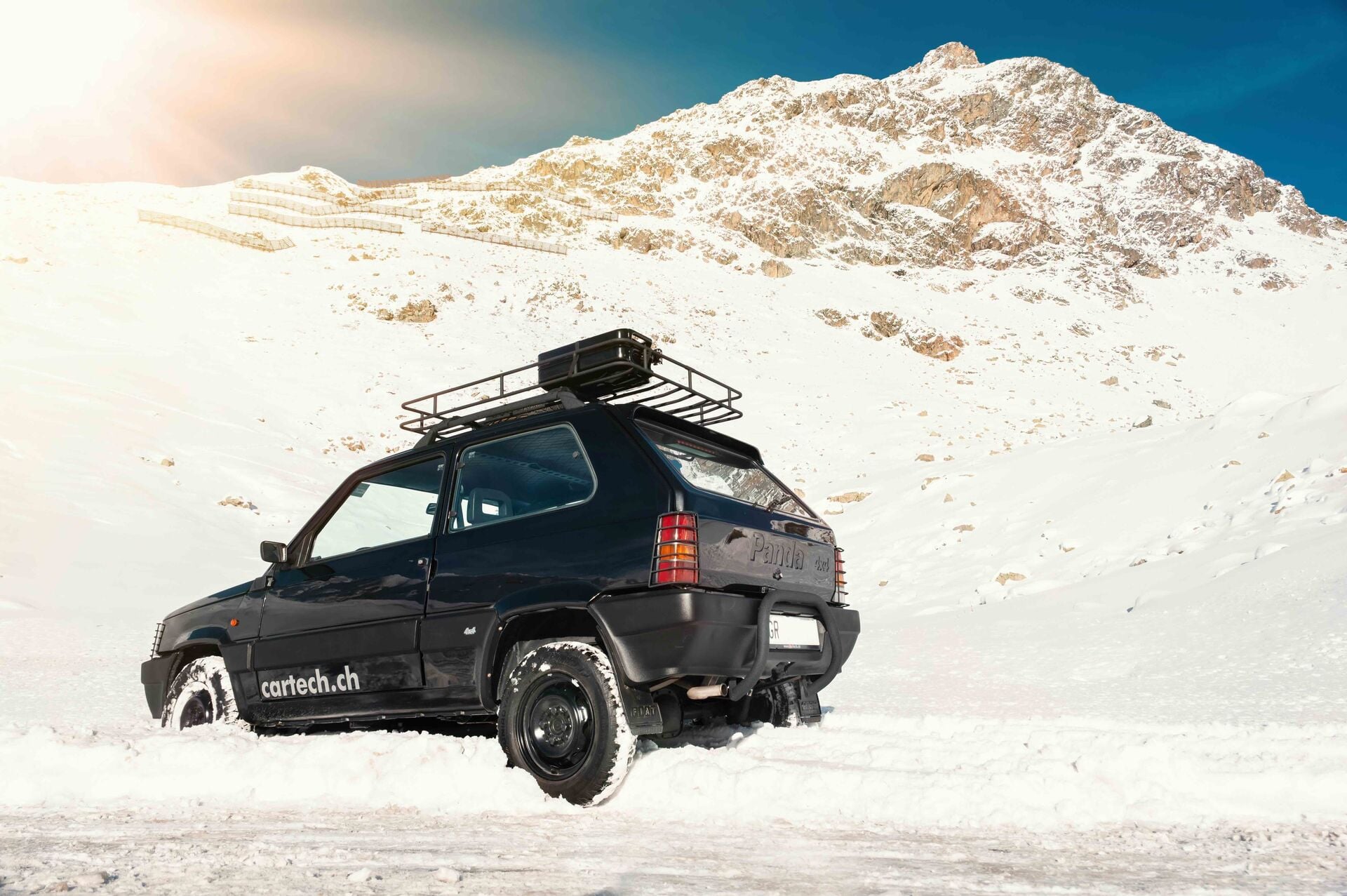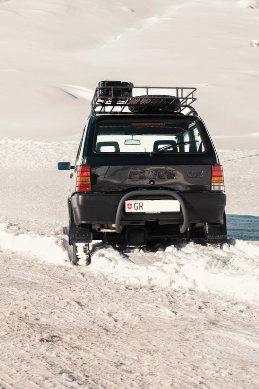 Dabei war der Fiat Panda 4×4 alles andere als ein Auto für lustige Millionäre. Er war das Fahrzeug von Carabinieri, Förstern, Bauern, Jägern – und von allen, die in den Alpen vorwärtskommen mussten. Leicht, schmal, kurz und mit Traktion ohne Ende. Der Panda 4×4 war ein Schweizer Sackhegel auf Rädern: vielseitig, robust, zuverlässig. Wenn ein Panda nicht mehr weiterkam, war für andere längst Endstation. Das stellte auch der schwarze Panda 4×4 by Cartech bei seinem Ausflug in den Tiefschnee eindrücklich unter Beweis. Mit dem Sperrdifferenzial gibt es für den Kleinen kaum Hindernisse. Er hüpft leichtfüssig über den Schnee und klettert den Berg hoch wie eine Bergziege – daher auch sein Übername «La Capra».