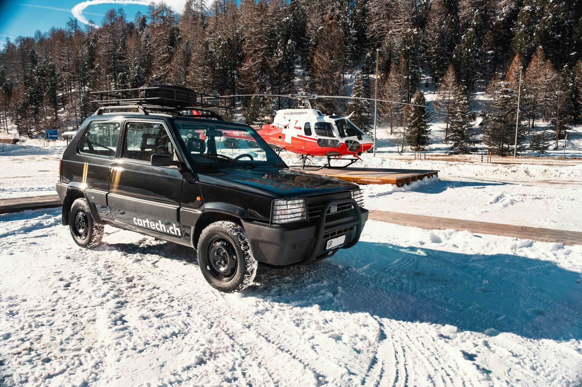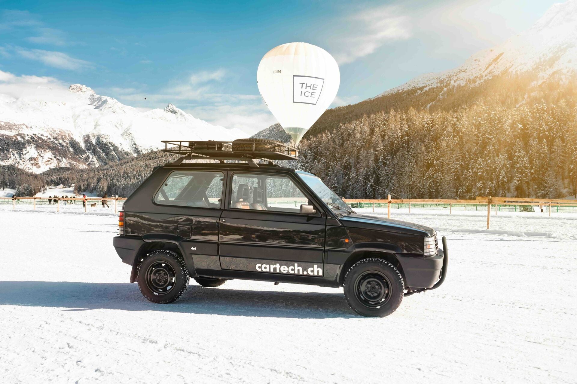 St. Moritz war auch Ziel dieses schwarzen Panda 4×4 by Cartech – ausgerechnet am The-I.C.E.-Wochenende, wo er zum heimlichen Star mutierte. Überall, wo er auftauchte, sorgte er für Lächeln und Sympathien – mehr als mancher Supersportwagen. Lustigerweise ist auch das Abschleppfahrzeug am I.C.E. ein Fiat Panda 4×4. Kleine Randnotiz: Auch der «Bürgermeister» von St. Moritz, Christian J. Jenny, fährt einen Panda 4×4 – mit Standartenflaggen. Zweifelsfrei: St. Moritz ist vernarrt in die kleine Kraxel-Kiste.
