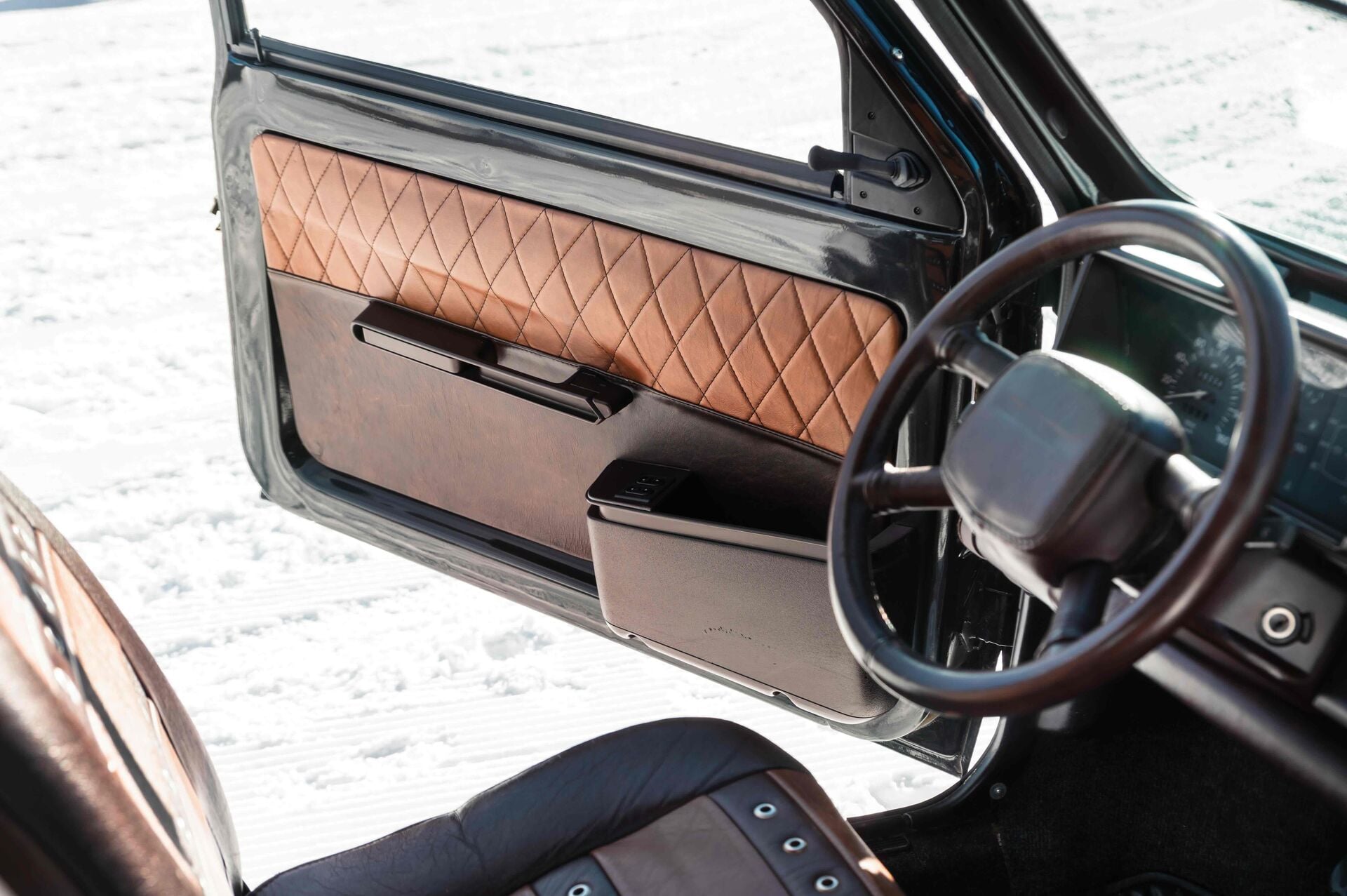 Cartech in Chur ist eigentlich für extravagante Supercars bekannt. Doch Inhaber Wolfgang Ulz liebt Autos mit Charakter. Und welches Auto hat mehr davon als der Panda 4×4? Keine Sorge: Dieses Exemplar wurde nicht auf 350 PS frisiert, sondern ist immer noch ein ganz normaler 1,1-Liter-Vierzylinder mit rund 54 PS. Das Besondere ist das Interieur. Hartplastik, flache Sitze und eine Heizung, die so schwach war, dass man selbst im Sommer Handschuhe tragen musste? Nicht hier. Während die Serienausstattung spartanisch ausfiel, durfte sich bei diesem Panda ein Sattler austoben und alles in Leder packen, was sich einpacken lässt.