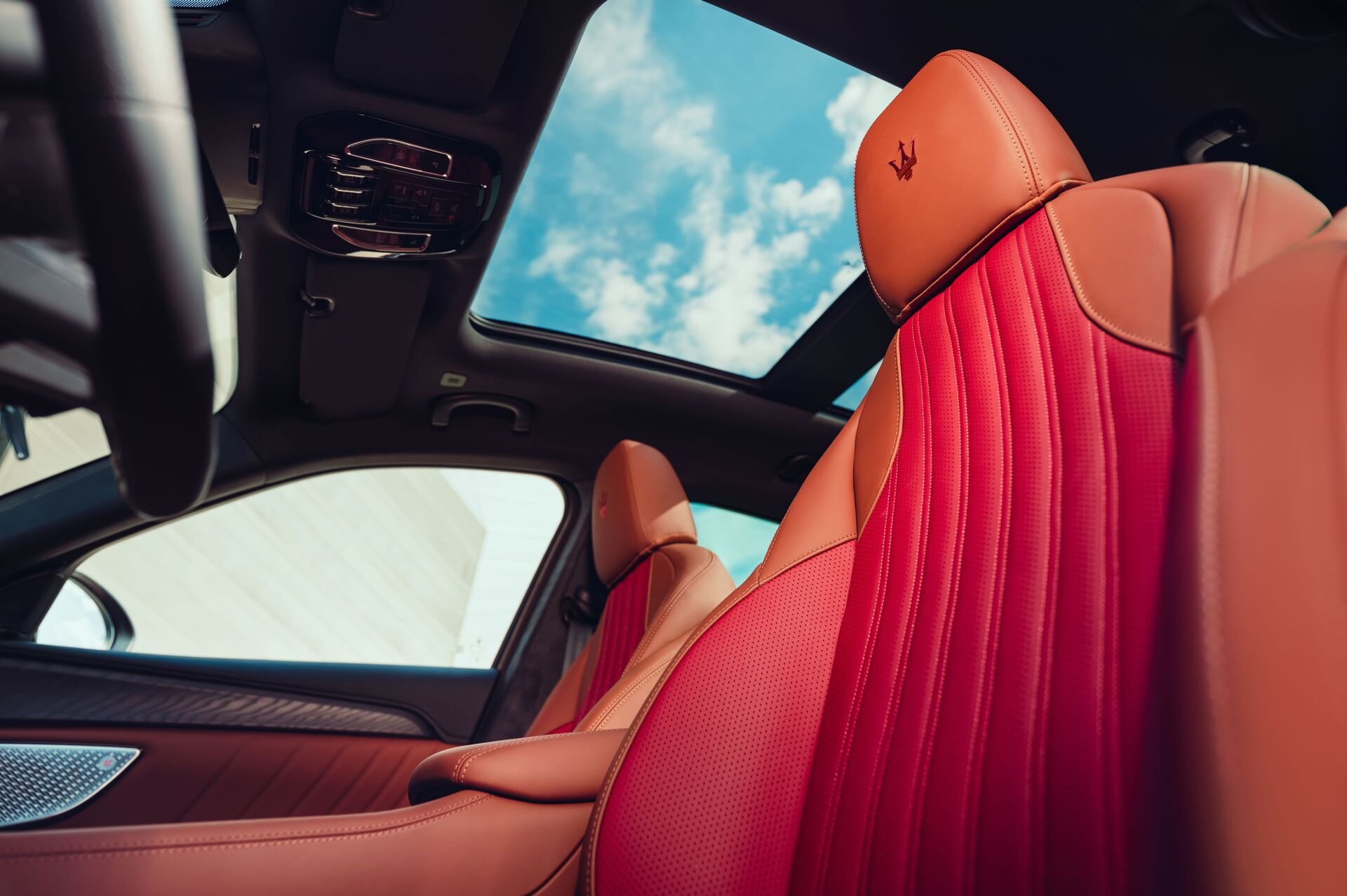 Das Interieur erinnert an das Flair einer toskanischen Villa: hellbraunes und dunkelrotes Leder, Cannelloni-Nähte (ja, das heisst wirklich so) und Maseratis Dreizack, fein auf die Kopfstützen gestickt. Dazu ein Soundsystem, das selbst Luciano Pavarotti wieder zum Leben erwecken könnte – und ein Panoramadach, das dem Begriff “Weinverkostung mit Aussicht” eine völlig neue Bedeutung gibt.