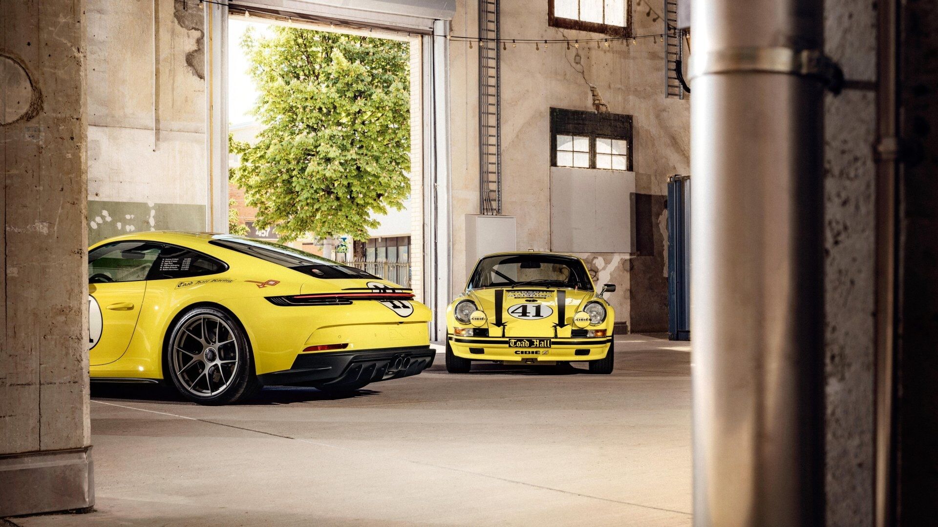 Doch dem nicht genug. „Ein Zwilling muss her”, hat sich der Sammler gesagt. Und getan. Die Porsche Sonderwunsch-Abteilung bekam den Auftrag, aus einem aktuellen 911 S/T eine Hommage zu zimmern. Der moderne Bruder musste natürlich auch Hellgelb tragen – was einfacher klingt, als es ist. Denn diese Farbe hat die Deckkraft von Zitronensorbet auf Butterbrotpapier. Besonders auf Carbon-Teilen ist es der Endgegner für jeden Lackierer.