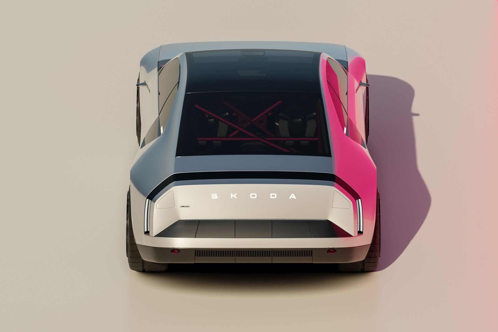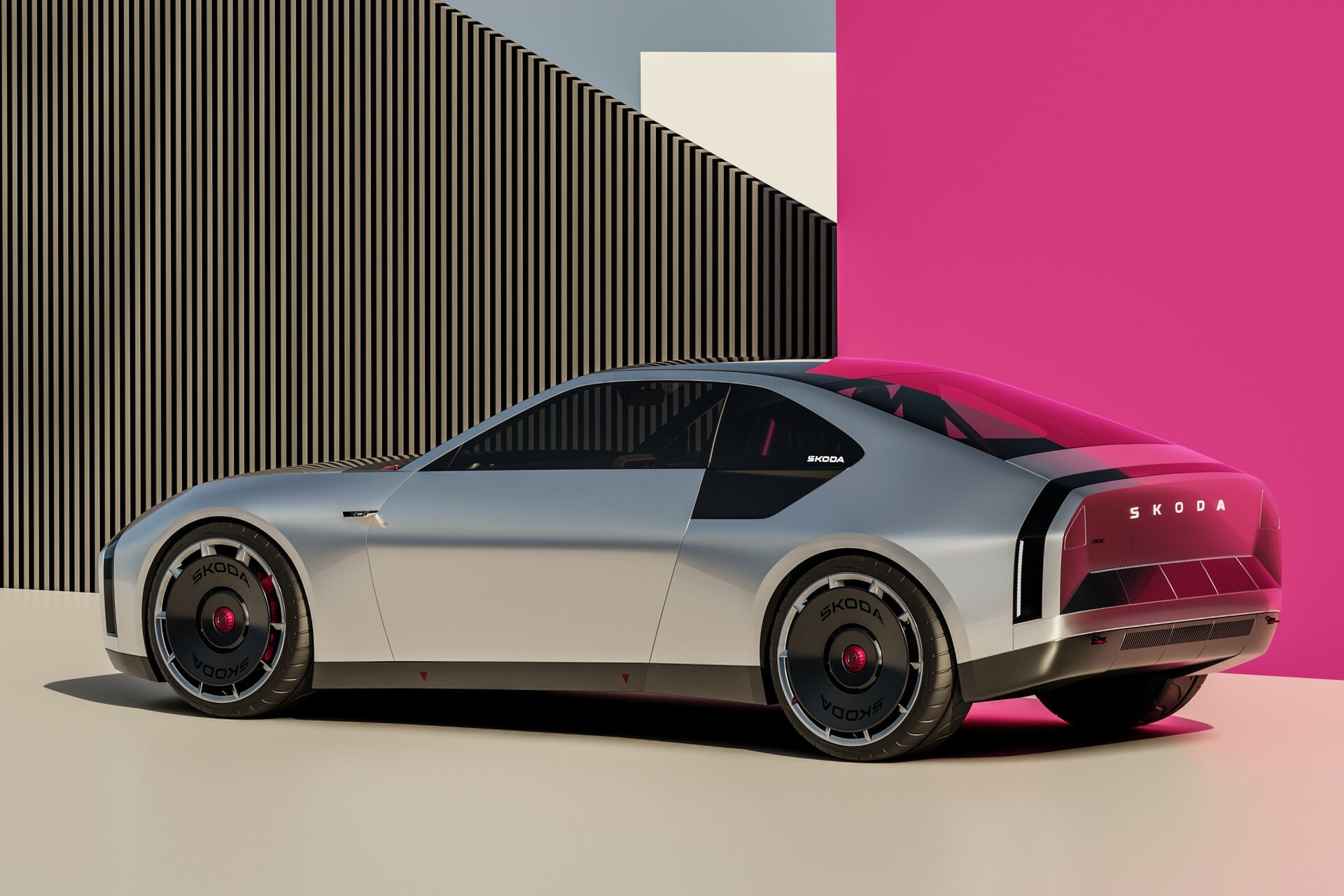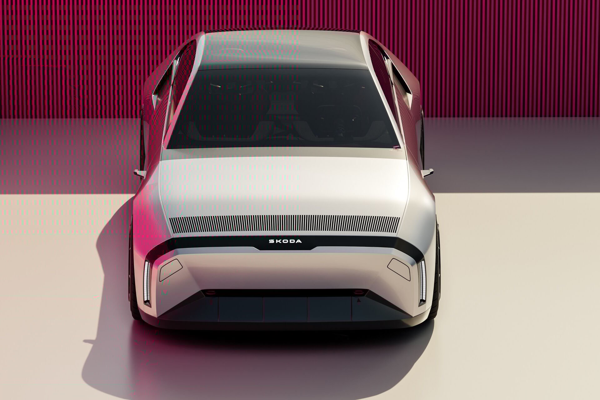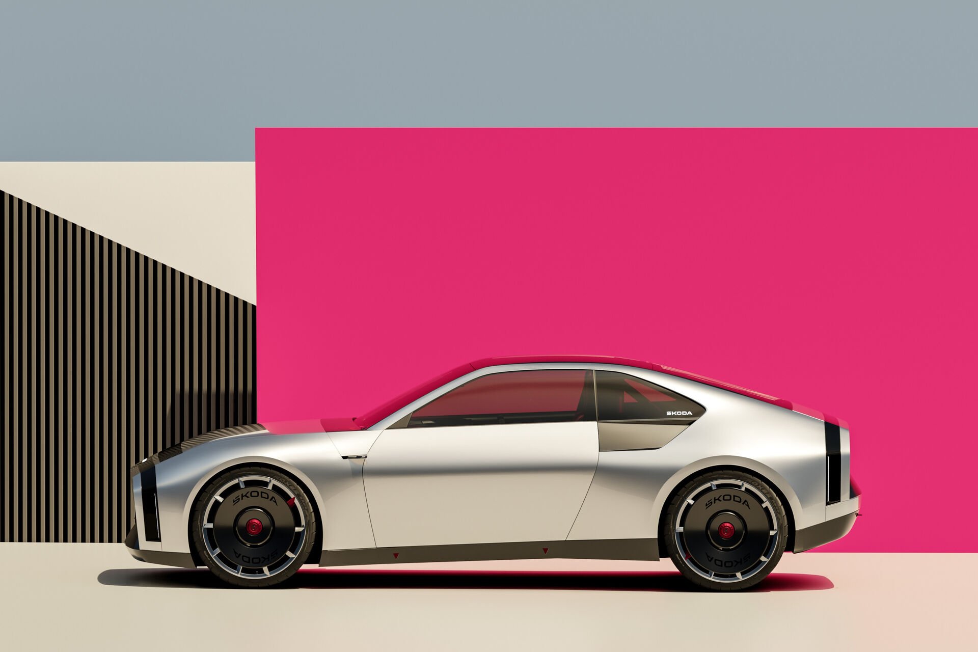 Nun hat Skoda das Coupé als Vorlage für eine Neuinterpretation genommen. Allerdings auch nur das – nix retro, sondern „modern solid“, ganz dem neuen Design-Prinzip von Skoda entsprechend. Klare Linien und kraftvoll modellierte Flächen prägen das Erscheinungsbild, ergänzt durch eine keilförmige Silhouette und markant ausgestellte Radhäuser, in denen Aero-Leichtmetallräder mit Zentralverschluss sitzen. Auffällig wirkt die Front mit zahlreichen Belüftungsschlitzen in der Haube, einem leuchtenden Skoda-Schriftzug und winzigen Scheinwerfern. Rückspiegel fehlen – sowas braucht es in Zukunft nicht mehr, in welcher die Autos autonom fahren werden.